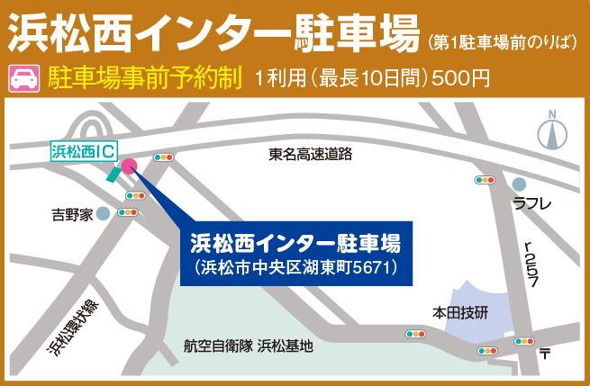 ■当駐車場ご利用のお客様は、浜松西IC第1駐車場または第2駐車場にお車をお停めください。